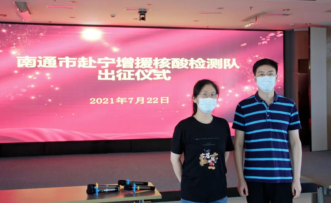 7月22日,南通市卫健委迅速响应,全力支援南京市开展新冠肺炎筛查工作,组派18家医院43名医护人员火速驰援南京。我院检验科副主任陈红兵、主管技师刘丹位列其中。抵达南京后,他们迅速进入工作状态,协助当地开展核酸检测工作。由于工作量巨大,应急核酸检测队实行轮班制,人歇机不歇,实验室24小时检测不间断。有时任务急,他们甚至连续工作十几个小时。扬州疫情形势严峻后,他们没有片刻休整,又立即随队奔赴扬州 ,支援当地核酸检测工作。7月26日、8月6日,我院又分别增派了朱姝、殷荣华、成可、赵玲玲、高文书5名检验人员。